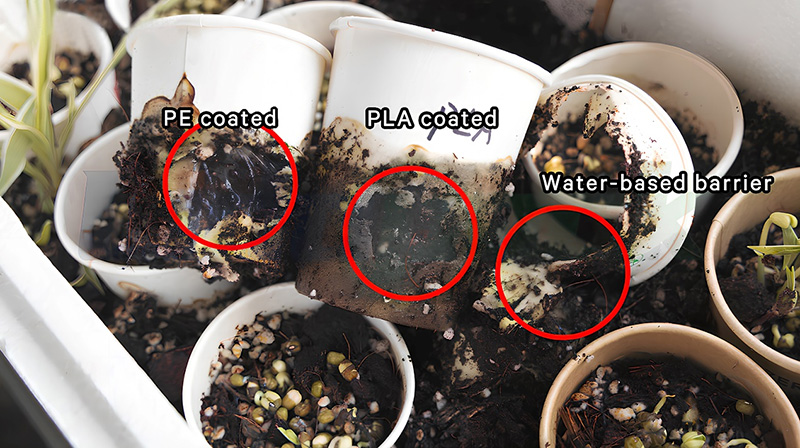 Na 245 dagen was de waterige beklede papieren beker volledig afgebroken, de vezels van PLA waren verslechterd, de film van PLA was in feite en de film van PE was in feite intact.
